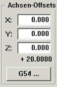 Falls ein Werkzeugwechsel den Nullpunkt in Z verändert, muss natürlich neu eingerichtet werden, sofern dieses nicht wie bisher durch Längenantastung oder Eingabe einer Werkzeuglänge korrigiert wird.Im Handsteuer-Dialog erscheint der als Materialstärke angegebener Wert unter dem Eingabefeld für den Z-Achsen-Offset, in diesem Beispiel "+ 20.0000". Die beiden Offset-Werte werden aufaddiert, der in der Handsteuerung eingegeben Offsetwert kann also zusätzlich verwendet werden.