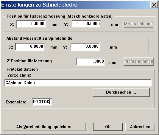 In der Regel wird die Messvorrichtung nicht in der Spindel eingespannt sein. Mit dem "Abstand Messstift zu Spindelmitte" legen Sie fest, um wieviel die Messvorrichtung von der Spindelmitte entfernt ist. Die hier abgelegten Werten werden bei den Messungen (auch die Referenzmessung) auf den Messpunkt (X/Y) aufaddiert. D. h. befindet sich die Messvorrichtung links von der Spindel (X-Achse) so ist der Abstand positiv anzugeben.