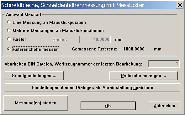 Mit "Position für Referenzmessung" legen Sie einen Punkt auf dem Maschinentisch fest, an dem die Referenz genommen werden soll. Der hier erfasste Messwert wird später von jeder Messung abgezogen. So bleibt als Ergebnis die Schneidenhöhe ab Tischoberfläche bzw. bezogen auf eine Referenzhöhe übrig.