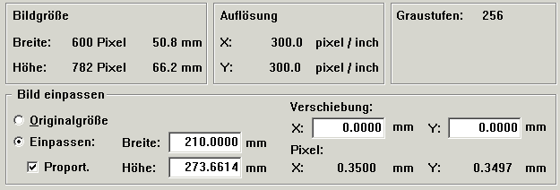 An diesen Werten kann man erkennen, wie die Auflösung des Bildes zu der gewünschten Auflösung (Bahnabstand) passt.